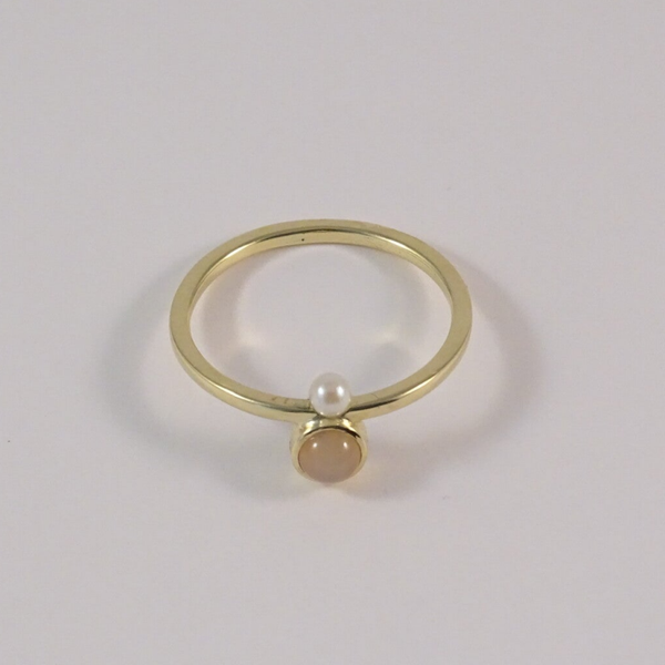 14 kt Geelgouden ring. De ring is 1,5 mm breed. De perzikmaansteen is 4,5 mm, inclusief zetkast 5,5 mm en de parel is 3 mm. Een sierlijk fijne ring. Ringmaat 18. De ring kan ook op maat gemaakt worden.