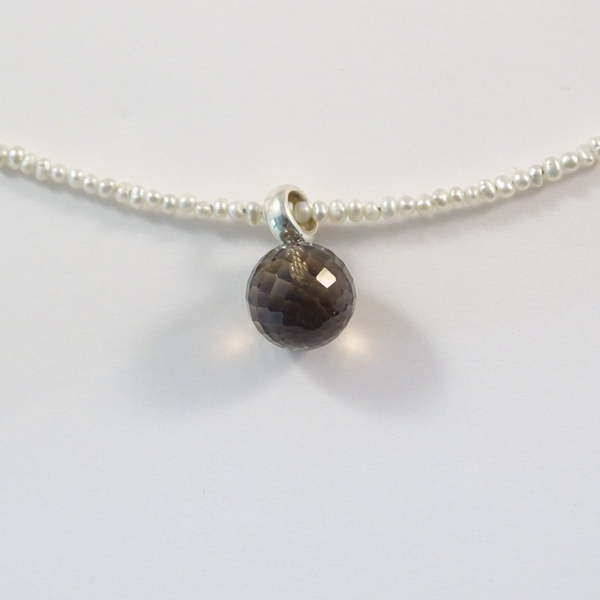 Het parelcollier is 44,5 cm lang. De parels zijn 2 á 2,5 mm groot. De zilveren hanger heeft een gefacetteerd rookkwartsbol van 10 mm. De hanger kan eraf, zodal het collier ook los gedragen kan worden. Een mooi sierlijke parelcollier.